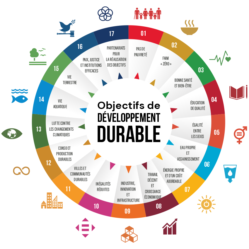 Les Objectifs de Développement Durable (ODD) de l’ONU : 17 objectifs universels adoptés en 2015 (voir image ci-contre).